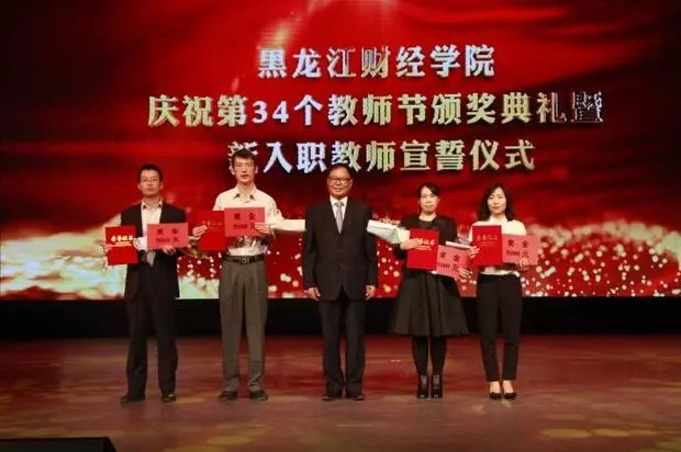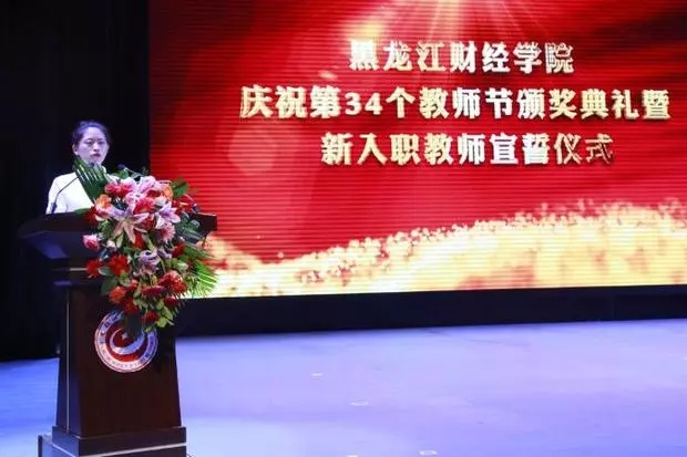 典礼在齐唱国歌声中拉开序幕,大屏幕播放了学院2017-2018学年度教学质量奖、优秀教师、优秀辅导员的获奖名单。党委书记裘杰为获得学院2017-2018学年度教学质量奖获奖者颁发了奖金、证书,魏院长为荣获学院2017-2018学年优秀教师、优秀辅导员获奖者颁发了奖金证书,学生代表向获奖者敬献了鲜花。会上,获奖教师代表会计系教师、学生代表经济系金融学专业学生刘洋依次上台发言,佟伯承老师在发言中回顾了自己从教奋斗历程,分享了自己在守好三尺讲台、奉献教育事业的收获与喜悦,激励青年教师奋发图强、无私奉献,教书育人,爱心和尊重铸就学生们飞翔的翅膀,饱含了着对学生的关爱之心、对学校的感激之情。刘洋同学对辛勤耕耘的老师们致以节日的祝福,诚挚感谢老师们的谆谆教诲,并决心要以出色的表现回报龙财,用热情与智慧和敬爱的老师们共同创造龙财更加美好的明天。