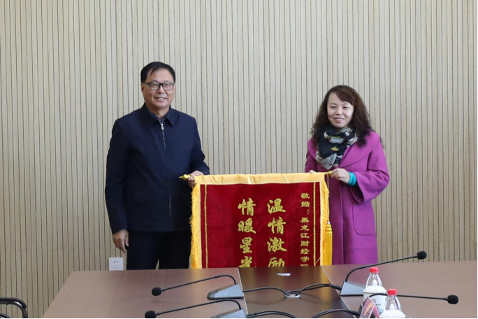 5月6日上午,我院与南岗区民政局、中国狮子联会哈尔滨代表处、农民工子弟学校赠送锦旗仪式在教学楼第五会议室举行。院长魏兆胜出席仪式并讲话。南岗区民政局局长赵晓春,中国狮子联会哈尔滨代表处主席王瑜琦、副秘书长刘曙音,全球服务团队GST主席张柏松,服务项目委员会主席姚文婷,和平海报委员会主席葛大威,王岗中心校校长刘红艳、副校长刘慧,星光小学校副校长马淑环,水泥小学校副校长汪洁,学院副院长董鲁敏,党政办公室主任徐雷,资产管理处副处长王超参加赠送仪式。常务副院长于长福主持仪式。