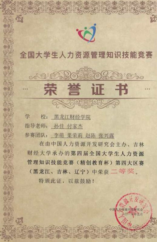 我院由管理系孙佳和付家杰担任指导教师,由李萌、果荣莉、赵陈、张兴露四名同学组队参加比赛。本次大赛的比赛内容为模拟人力资源六大模块在企业经营中的作用进行经营对抗。