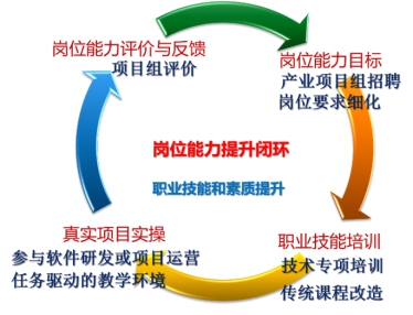 产业学院为软件开发、电商运营搭建了真实项目的平台,形成了项目人才招聘、培训培养、项目实操实作、项目考核评价的工作场景的环路,从而形成职业岗位能力培养的闭环。