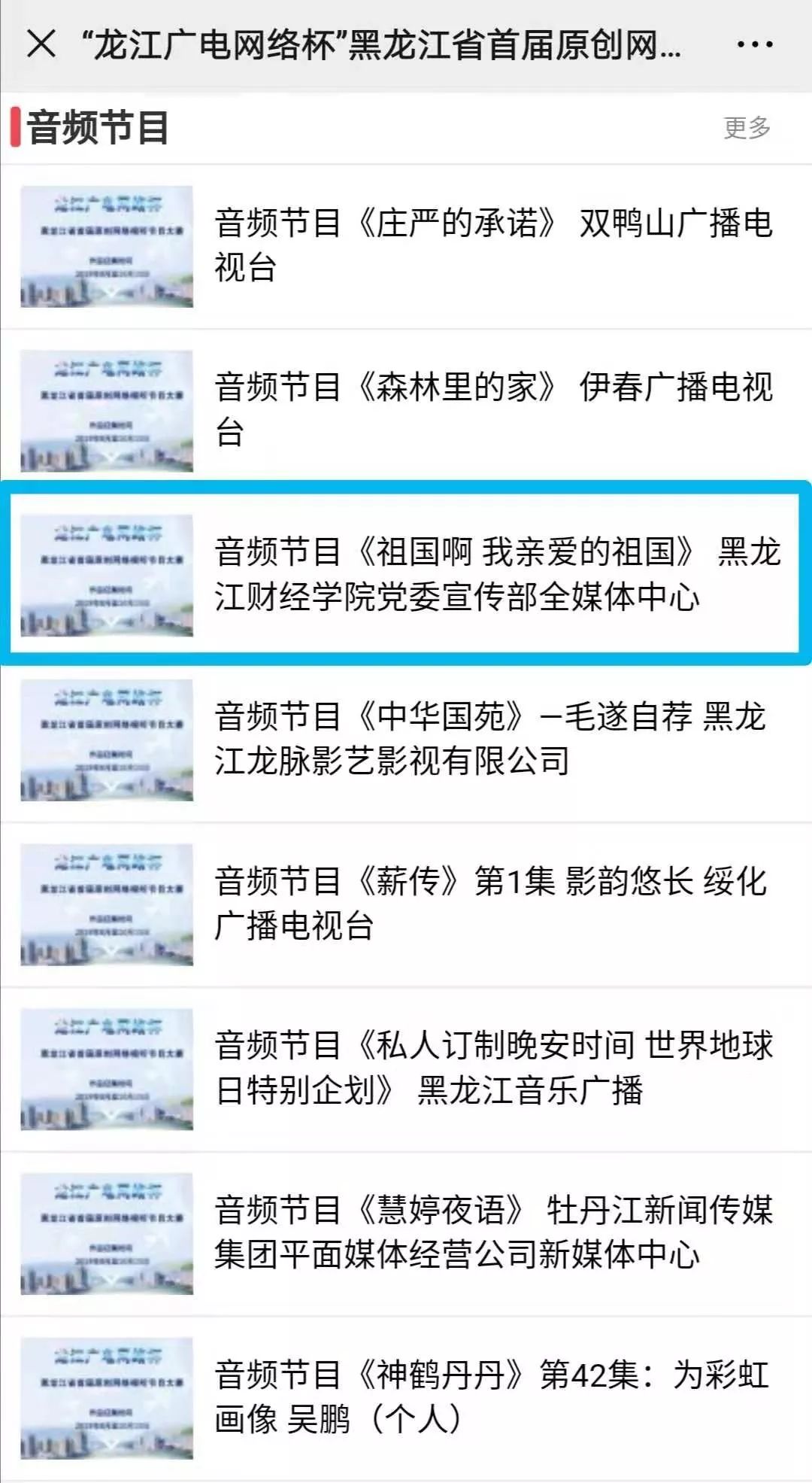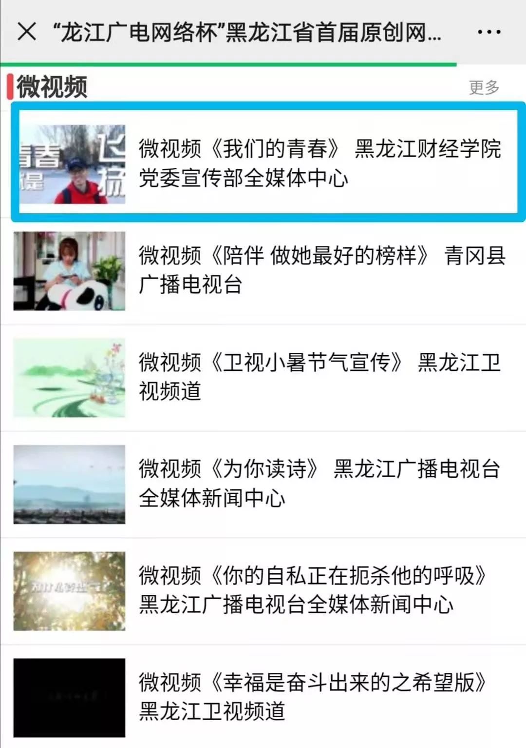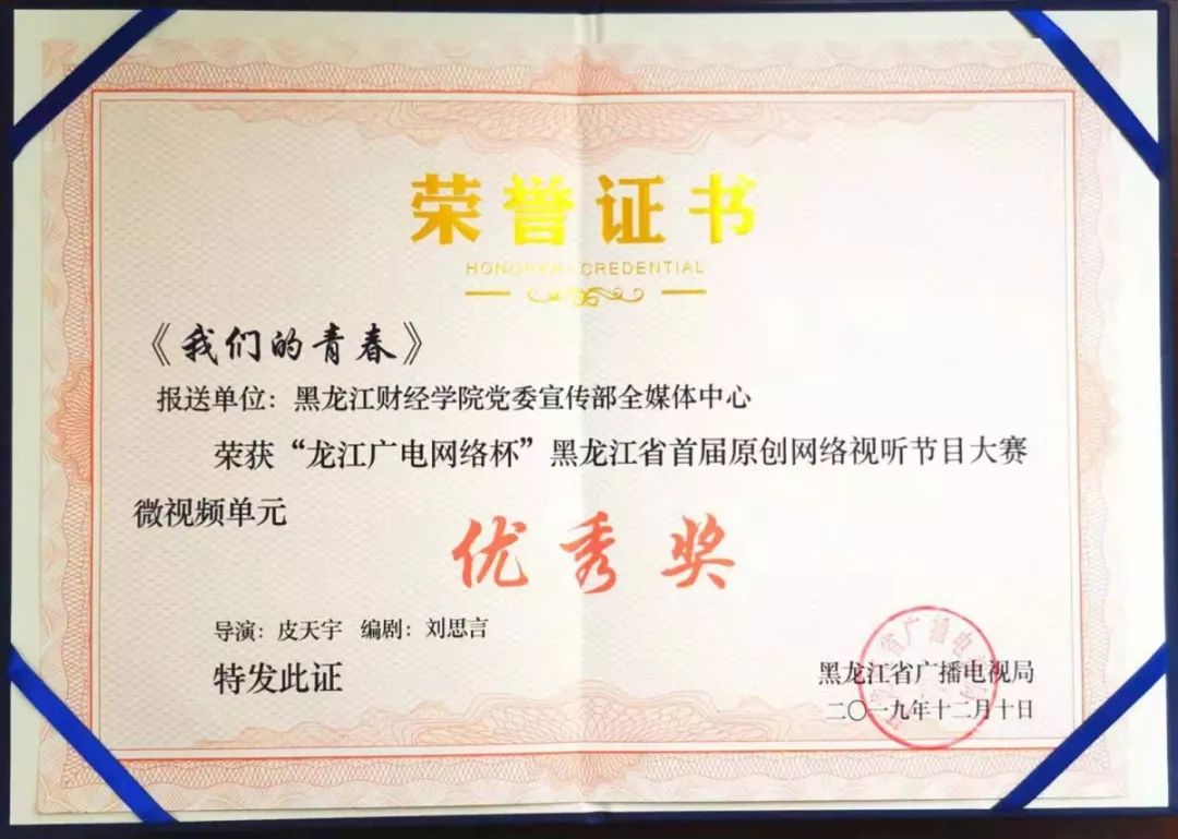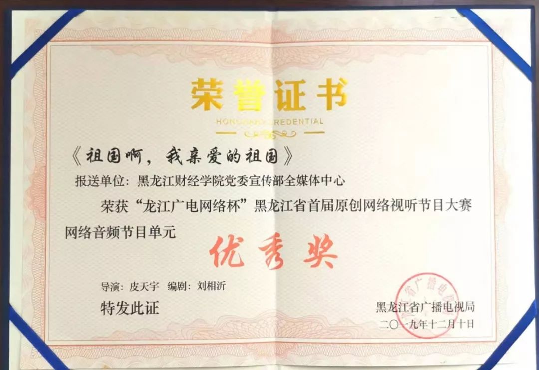 最终我院选送的微视频《我们的青春》(王贺剪辑)、网络音频节目《祖国啊,我亲爱的祖国》(冯潇录制)脱颖而出,分获微视频单元优秀奖,网络音频节目单元优秀奖。现获奖作品已发布在“无限龙江”APP大赛专区。