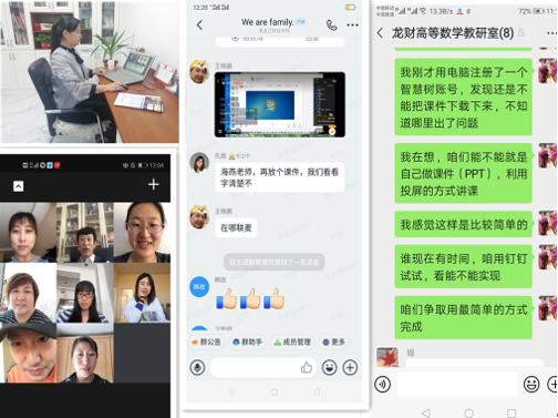 在居家的状态下开展在线教学,教师们遇到的困难有很多。首先要有一个安静的授课环境,这对于家里有小孩子的大多数教师来说是第一个挑战,要千方百计的把孩子安置好。然后还需要良好的电脑设备条件,为了保证线上教学顺畅不卡顿,有的老师特意网购了新的电脑,还有的老师购买了长长的网线以及其他配套设备,全力做好线上教学准备。接下来还要学习网络教学平台操作方法,老师们以教研室为单位,以课程为单元,按照学校网络教学要求,对钉钉、微信、QQ课堂、腾讯会议等教学平台进行提前学习、体验和测试,对网络教学可能出现的问题做好预案。老师们积极交流沟通,互相提醒,一致认同要提前做好准备,还要穿戴整齐,以良好的精神风貌进入网课状态。