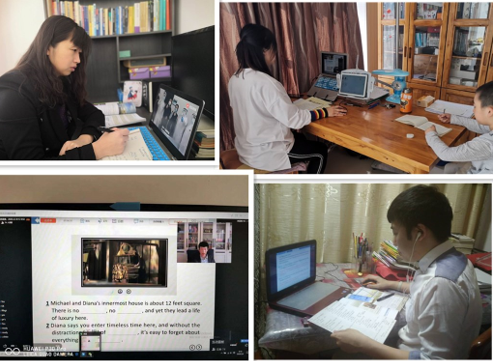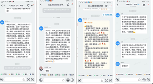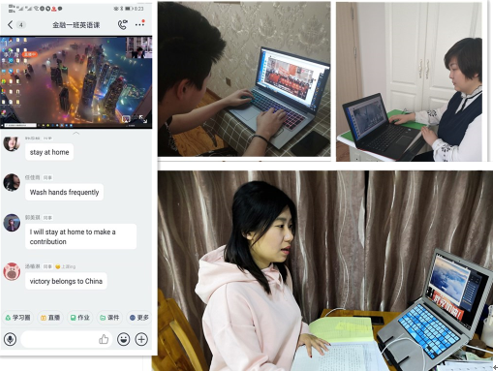 老师们通过线上文字沟通和视频、语音连线,反复沟通商议,确定具体教学内容、教学资料和环节设计,集思广益开展线上集体备课。教学管理人员深入在线课堂听课、巡课,指出教学问题、提出教学建议,并将课堂上好的教学方法和教学状态截图发到教师群,供教师们交流学习。经过一段时间的在线教学实践和研讨交流,老师们获得了很多在线教学体会。首先是要利用在线教学培养学生自主学习习惯。在进行教学设计的时候要多给学生思考题,教学素材学生可以自己完成的,尽量在线下留给学生,培养学生良好学习习惯,教师利用网络课程有效的时间答疑解惑,讲重点和难点。然后是要利用在线教学推进因材施教。线上教学允许教师采用不同的媒体手段,这种全新尝试有利于体现学生的主体地位,启发诱导学生主动参与教学,教师可以通过设置使不同层次的学生都有完成教学任务的机会,做到因材施教,从而全面提高每一个学生的学习成效。耿莉莉、崔艳等五位老师翻转外语改革试点的工作更是积极有序的在线进行着,她们每天研究在线教学策略、督促学生完成当天学习任务、统计学生学习成绩和进度、重新分组、反馈总结等等,忙的不亦乐乎,但看到学生的进步,她们感觉很有成就感,累但是心里甜。