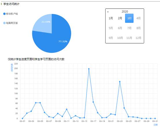 以2018级动画1班的学生为例,数据采集在线上教学的第四周,全班共19名学生。22.68%的学生选用电脑听课,77.32%的学生选用手机或平板电脑听课。4周人均访问量为828次/19人≈43.58次/人,即周平均10.89次/人,每人平均学时时长为171分钟。教师课前要求完成慕课在线学习任务点比例为30/122,所有学生都超额完成;要求完成学分比例为25/100,所有学生都超额完成。慕课学习效果非常好,超出预期要求,说明学生学习热情高涨,对本门课程兴趣浓厚。