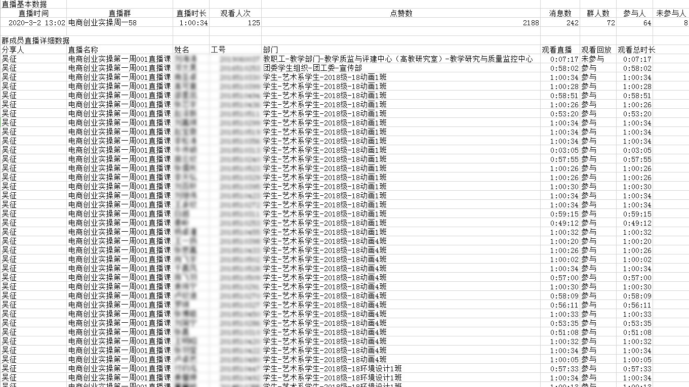 钉钉直播平台流畅度高,听课效果好。所有学生都在第一轮直播后进行了回看,并在课堂进行了积极的互动,总共互动次数为2188(点赞)+242(答题)=2430次,人均参与课堂互动次数为2430/70≈34.71次,教学效果良好。