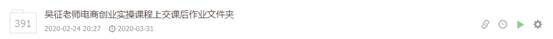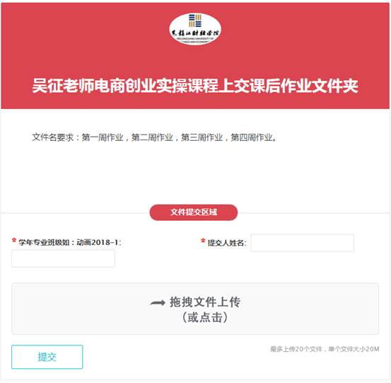 专门为此课程打造的电商创业实操课程作业上交系统,上交网址为http://xzc.cn/TBkU4Iu3PC,上交页面如下图所示,可以使用手机或电脑端提交。4周作业上交次数为391次,人均上交作业5.58次/周。作业提交量超过100%。