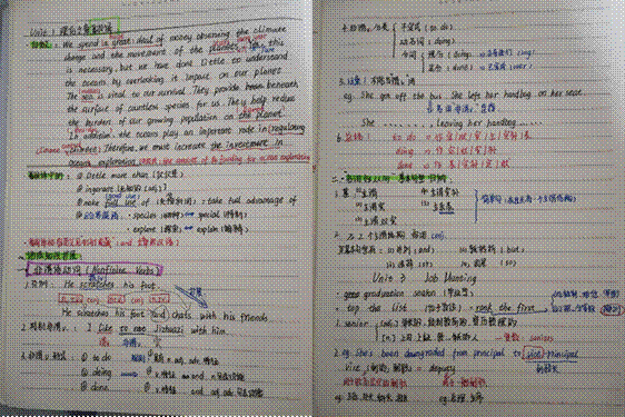 记录的非常仔细,也十分用心,笔记就是应该这样的,即全面又工整,同学们都很佩服,好记性不如烂笔头,通过笔记与自己对话,也是一种享受!英语笔记最好是干净利落,简明扼要并且突出重点,你是最棒的哦!