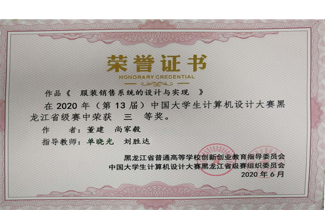 获奖作品2:服装销售系统的设计与实现类别:软件应用与开发/Web应用与开发等级:省赛三等奖作者1:董健(2016级计算机科学与技术专业)作者2:尚家毅(2016级计算机科学与技术专业)指导教师:单晓光、刘胜达