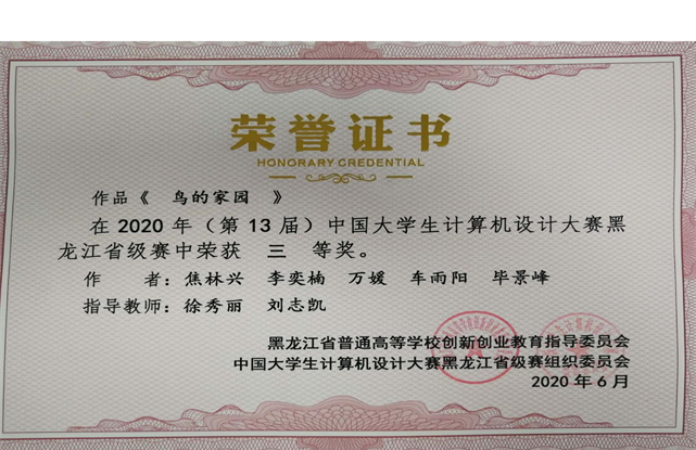 获奖作品3:鸟的家园类别:数媒游戏与交互设计/游戏设计等级:省赛三等奖作者1:焦林兴(2016级电子信息工程专业)作者2:李奕楠(2018级电子信息工程专业)作者3:万媛(2016级电子信息工程专业)作者4:车雨阳(2019级电子信息工程专业)指导教师:徐秀丽、刘志凯