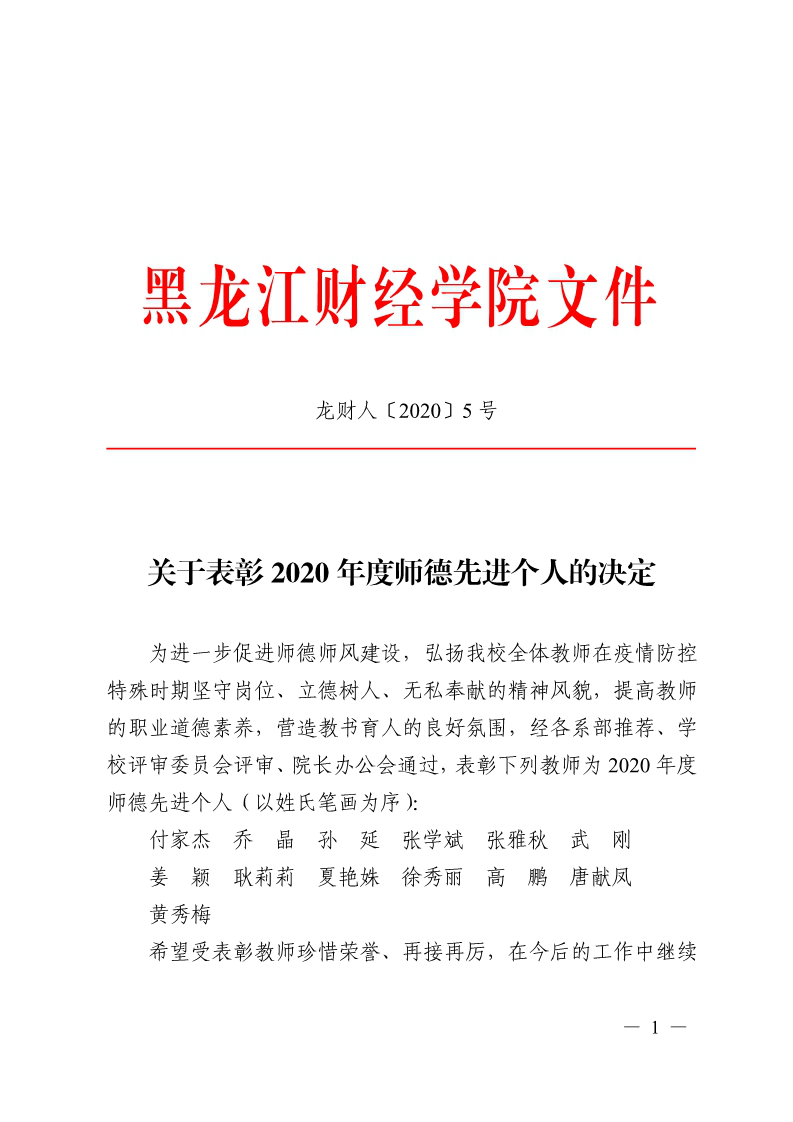关于表彰2020年度师德先进个人的决定
