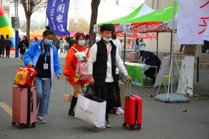 学院迎新车队旁,志愿者帮助新生搬运行李
