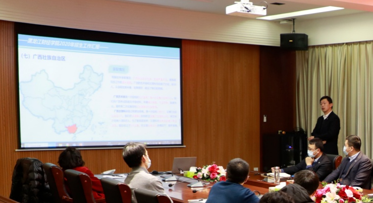 会上,招生处副处长董波就2020年招生工作情况作汇报,他从省内外分专业招生情况、专升本招生情况、新生报到情况、生源分布情况、招生宣传情况等方面进行了总结分析。