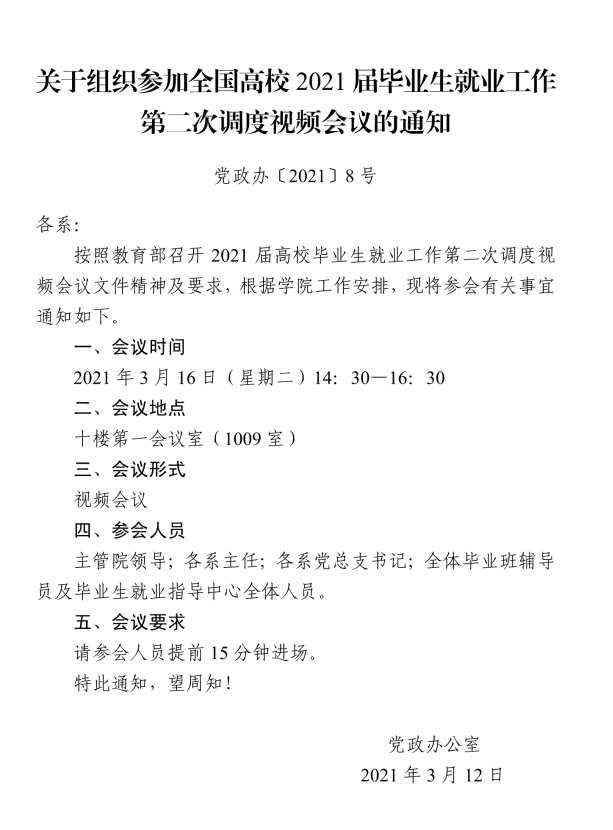 关于组织参加全国高校2021届毕业生就业工作第二次调度视频会议的通知