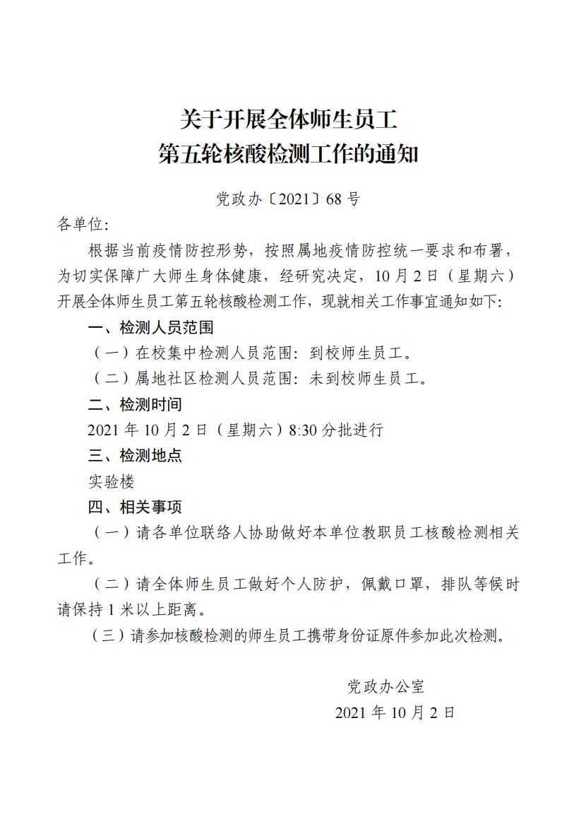 关于开展全体师生员工第五轮核酸检测工作的通知
