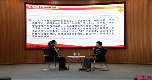 党委委员、党委宣传部部长兼党委统战部部长皮天宇、学工部、学生处处长冯玉龙、教师发展中心主任田月秋、组织部副部长唐倩、教务处副处长郑海珊担任本次评委。各学院党总支书记、学生处副处长、团委书记和全体辅导员到场观摩。“谈心谈话”环节通过情景再现的方式展开,主要考察辅导员对学生成长成才规律的了解把握程度、对学生的教育引导能力、解决困惑和实际问题的能力等。参赛选手直面问题、思路清晰、循循善诱,展现了学校辅导员队伍良好的专业素养和担当实干的精神品质。