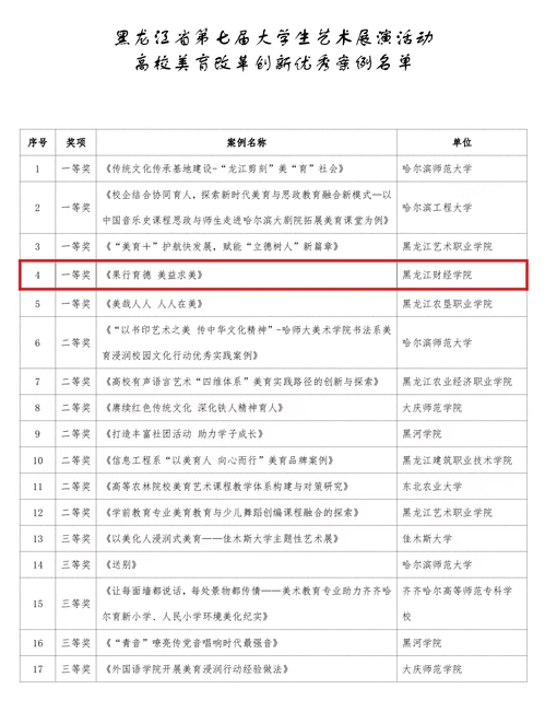 艺术学院提交的《果行育德美益求美——KYTY.COM开云体育(中国)科技公司美学美育系列课程建设与推进模式案例》,荣获黑龙江省第七届大学生艺术展演活动高校美育改革创新优秀案例一等奖。
