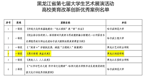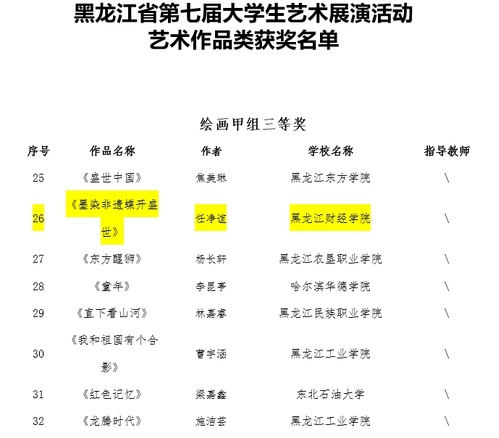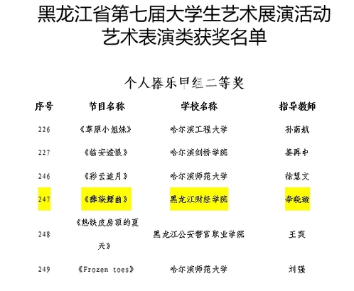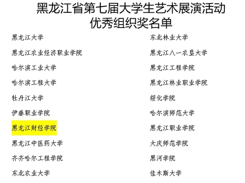 近期,由省教育厅主办、黑龙江日报报业集团承办的黑龙江省第七届大学生艺术展演活动艺术表演类获奖名单公布。经专家评审,我校获得艺术表演奖二等奖1项,学生艺术作品奖三等奖1项,高校美育改革创新优秀案例一等奖1项,我校获得优秀组织奖。