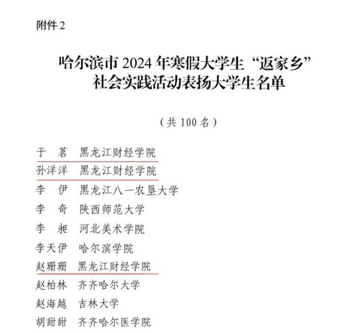 为深入学习贯彻习近平总书记在同团中央新一届领导班子集体谈话时的重要讲话精神,引领青年学子返回家乡参与实践,服务家乡建设发展,加强哈尔滨青年发展型城市建设,发挥育人实效,团市委组织开展了2024年寒假大学生“返家乡”社会实践活动总结工作。对在2024年寒假大学生“返家乡”社会实践工作中表现突出的单位和个人通报表扬。我校3名学生入围2024年寒假大学生“返家乡”社会实践活动表扬名单。
