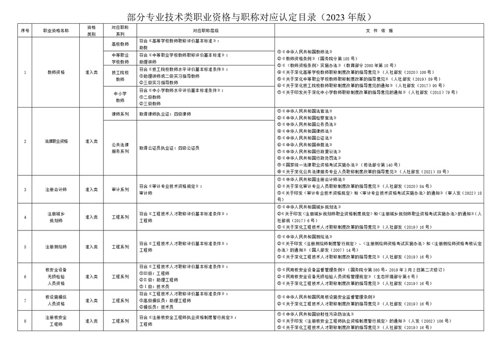 一、专业技术人员取得《部分专业技术类职业资格与职称对应认定目录(2023年版)》(附件)所列职业资格,即可认定其具备相应系列、层级的职称,用人单位可按管理权限及相关规定聘任相应专业技术职务,无需换发职称证书,专业技术人员可据此作为申报高一级职称的条件。
