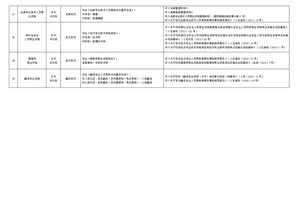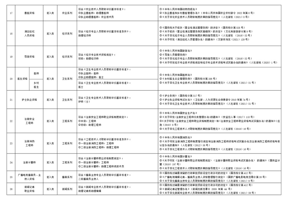 为贯彻落实省委、省政府新时代人才工作部署,进一步推动职业资格制度与职称制度有序链接,减少对专业技术人员的重复交叉评价,我们根据国家职业资格制度改革和深化职称制度改革相关政策规定,进一步规范了部分职业领域专业技术类职业资格与职称对应关系,现就有关事宜通知如下: