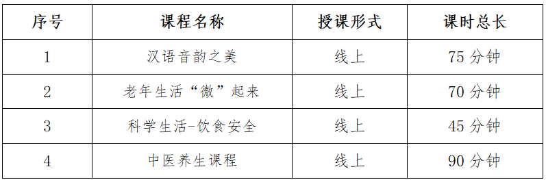 开设课程:汉语音韵之美、老年生活“微”起来、科学生活-饮食安全、中医养生课程,具体课程如下表: