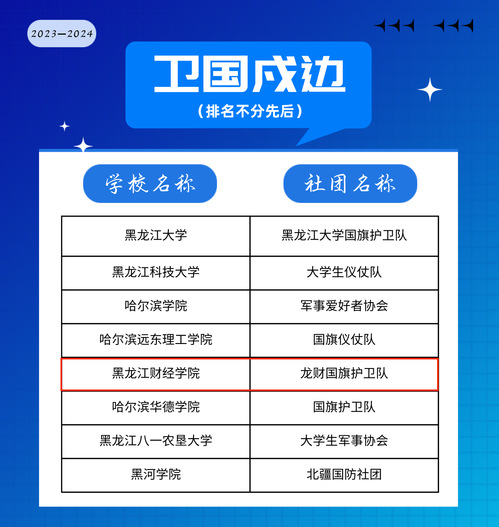 为进一步激发高校学生社团活力,充分发挥学生社团育人功能,团中央基层建设部指导中国青年报社开展2023-2024学年高校“活力社团”风采展示活动,集中展现高校学生社团创新经验做法。团黑龙江省委学校部、黑龙江省学联积极开展“活力社团”评选活动,我校龙财国旗护卫队入选2023-2024学年黑龙江省高校“活力社团”TOP100榜!