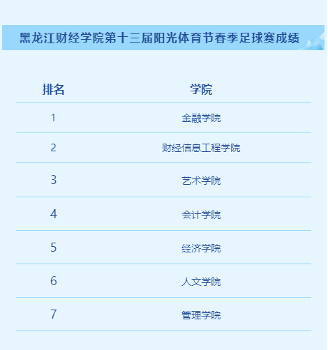 本次足球赛共7支学院代表队参赛,本次比赛赛制分小组赛、淘汰赛,共16场比赛。经过5天的激烈角逐,运动员充分发扬顽强拼搏精神。最终,金融学院获得冠军,财经信息工程学院获得亚军,艺术学院获得季军。