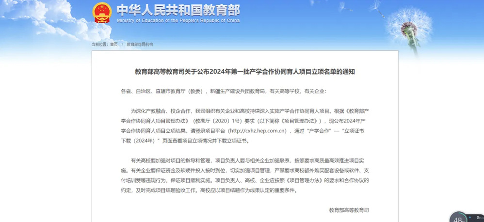 教育部产学合作协同育人项目由教育部高教司组织,是深化产教融合、产学合作、协同育人,汇聚企业资源,以产业和技术发展的最新需求推动高校开展课程体系建设、教学内容改革、师资培训、创新创业教育改革、实践条件建设等人才培养改革的重大举措。