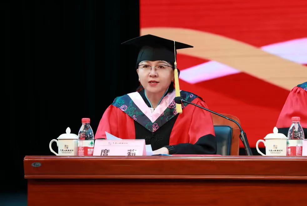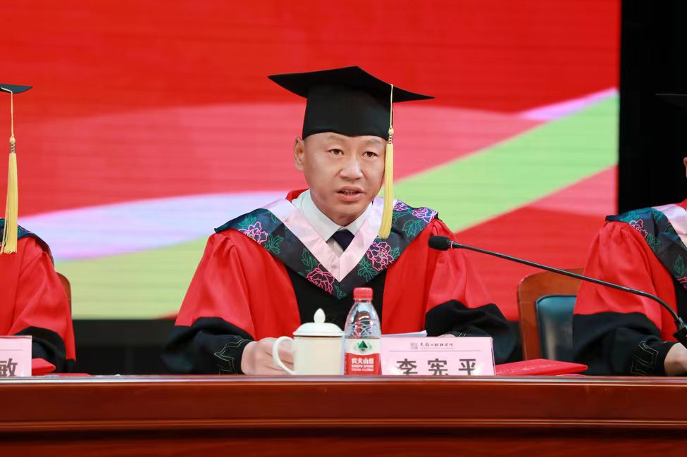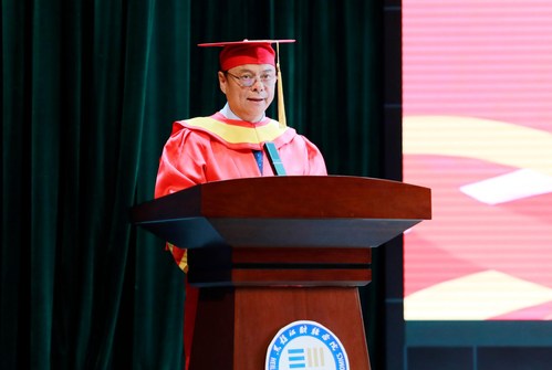 于长福代表学校向毕业生致辞,他表达了对毕业生们的衷心祝福和不舍之情,围绕“健康、事业、家庭”这三件人生大事为毕业生们送上“最后一课”,并提出了四点希望:一是希望同学们坚守人生志向,行稳致远不忘初心。立志做一个有道德、有修养、有文化的人,用自己的行动和言行影响身边人,传递正能量。二是希望同学们强化创新思维,终身学习勇攀高峰。以开阔的视野,站在历史的塔尖,张望更加遥远的未来,探索五彩斑斓、生动有趣的世界,传承生生不息的历史文脉。三是希望同学们践行使命担当,奋斗不懈绽放光彩。坚定“把每一项平凡工作做好就是不平凡”的恒心,保持“把每一件小事情做好就是大事业”的匠心,在各自岗位上兢兢业业、精益求精,创造龙财人别样的精彩。四是希望同学们心怀感恩之情,坚韧豁达向前。要有滴水之恩当涌泉相报的情怀与品格,感恩父母、感恩同学、感恩师长、感恩母校,常想老师的谆谆教诲、同窗的嬉笑欢乐和曾经触动的瞬间和成长的点滴。天下没有不散的筵席,但母校永远是同学们坚强的后盾和温暖的港湾。愿同学们不负时代、不负韶华,以青春之名,拥抱未来,以青春之我,逐梦未来。
