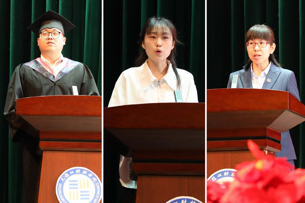金融学院2020级投资学专业许铁南同学代表毕业生发言,表达了对老师、同学的感激与不舍,对母校的眷恋与祝福,并表示无论身在何处,龙财是我们永远的家,将带着所学本领扬帆启航,与母校一起并肩奋进,担当起强国建设、民族复兴的重任,在新征程上奋力书写挺膺担当的青春篇章。人文学院2022级法学专业尹纹博同学对毕业的学长学姐表达衷心的祝福,并表示会以学长学姐为榜样继续努力,为校争光。会计学院牛巍代表教师发言,希望毕业生们能始终保持对知识的渴望和对学习的热情,在未来的日子里,脚踏实地、积少成多,追逐最耀眼的光芒,征服最险峻的高峰,走向更广阔的未来。