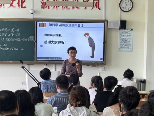 为进一步强化前一阶段课堂教学能力提升活动的效果,在三轮课程的研磨、反思和改进的基础上,会计学院于7月3日开展青年教师优秀教学展示观摩活动,推选出两名优秀青年教师代表展示磨课成果,旨在建立教师交流机制、提升教学质量效果、促进教学创新发展。此次观摩活动由会计学院副院长安慧心主持,院长吕广仁出席,并特邀于长福校长和吕玮教授亲临现场旁听指导,会计学院全体教师参加。