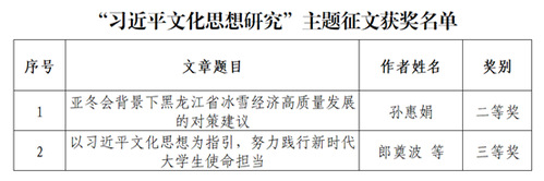 近日,省社科联公布了“习近平文化思想研究”主题征文获奖名单,依据《黑龙江省社会科学界联合会主题征文工作管理办法》相关规定,按照《“习近平文化思想研究”主题征文工作方案》安排,省社科联、省文联联合开展了“习近平文化思想研究”主题征文活动,经各阶段评审,我校共组织9篇作品参评,2篇获奖。