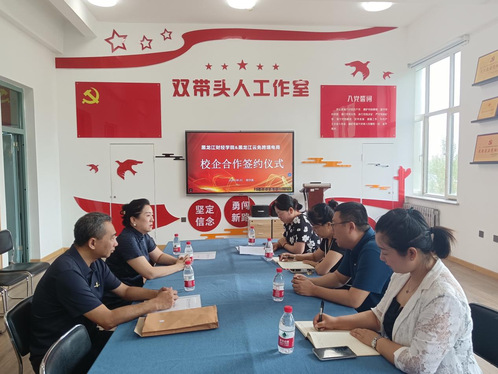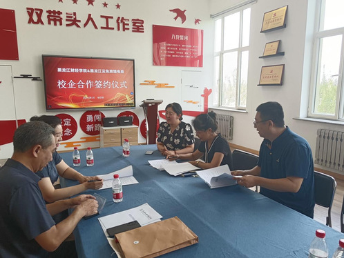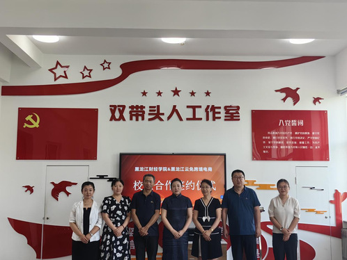 8月20日经济学院与黑龙江云免跨境电商有限公司校企合作和校外实习基地签约仪式在经济学院双带头人工作室隆重举行。经济学院院长董雪梅、党总支书记于水、副院长刘世鹏和国际经济与贸易专业教师潘小敏,云免跨境电商总经理杨滨华,财务总监田巍出席签约仪式。