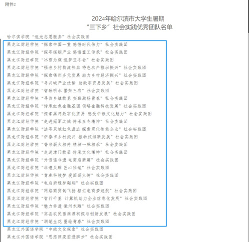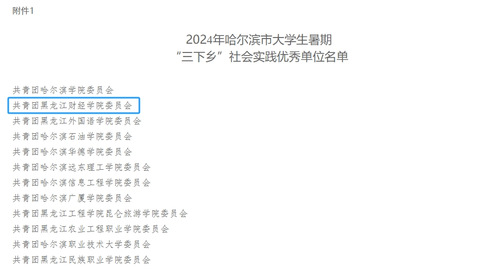 为深入总结交流经验、选树典型宣传、推动引领示范、激励广泛参与、发挥育人实效。团市委通报表扬一批在2024年哈尔滨市大学生暑期“三下乡”社会实践活动中表现突出的优秀单位、优秀团队、优秀个人、优秀品牌项目,我校8个单位荣获2024年哈尔滨市大学生暑期“三下乡”社会实践优秀单位;24个团队荣获2024年哈尔滨市大学生暑期“三下乡”社会实践优秀团队;24人荣获2024年哈尔滨市大学生暑期“三下乡”社会实践优秀个人;7个品牌项目荣获2024年哈尔滨市大学生暑期“三下乡”社会实践优秀品牌项目。