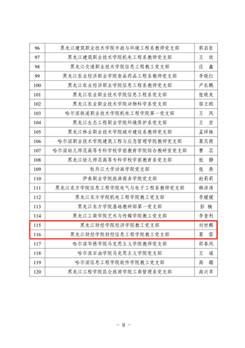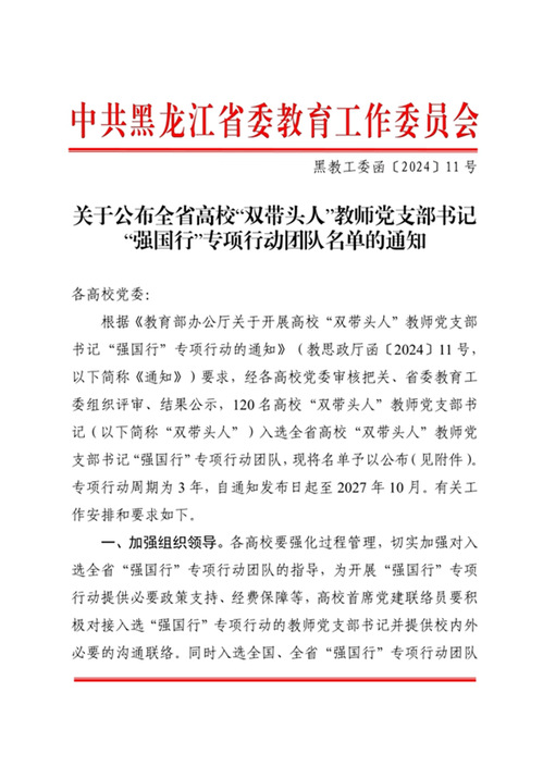 近日,黑龙江省委教育工委公布了全省高校“双带头人”教师党支部书记“强国行”专项行动团队名单,我校财经信息工程学院教工党支部、经济学院教工党支部成功入选。