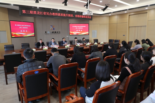 为进一步提升教师的职业素养、教学技能和教育理念,拓宽国际化视野,11月15日,我校在尚德楼第一会议室召开第三期黑龙江省民办教师素质提升深圳、香港研修班动员会。黑龙江省民办教育协会副秘书长张黎出席会议,校长于长福作动员讲话,副校长佟笑菊、副校长徐雷参加会议,教师发展中心主任田月秋主持会议。