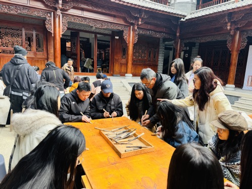 师生团队还深入束河古镇与沙溪古镇,溯源茶马古道上的建筑智慧。走进剑川县,拜访国家级非遗“剑川木雕”传承人。在传承人工作室,学生们聆听千年木雕技艺的传承故事,学习浮雕、透雕等传统技法,并亲手参与制作木勺与发簪。从选料打坯到精雕细琢,刀锋在木料上舞动的每一刻,都让学生深刻体悟“匠心”二字的分量。