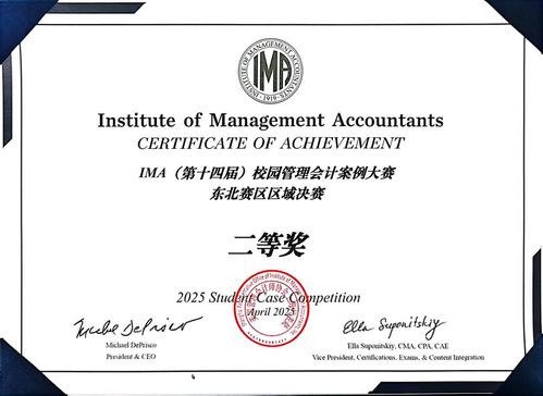4月26日,IMA(第十四届)校园管理会计案例大赛东北赛区决赛在大连海事大学Hic多功能厅完美收官。本届大赛于2024年10月启动,会计学院积极备赛,历时6个月,首次在东北赛区高校中脱颖而出进入决赛。在决赛的舞台上,会计学院Titan Warriors代表队在指导教师吕杨杨、寇冠、张冰茹的悉心指导下,学生团队张智琦、常雨乐、高淼、田津铭、符崇静默契配合,与东北财经大学、哈尔滨工业大学和大连海事大学东北地区高校代表队同台竞技。他们尽显专业风范与团队协作精神,在激烈比拼中脱颖而出,荣获东北赛区二等奖。